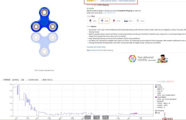 最典型的指尖陀螺,這是一個(gè)1200多評論的Listing,在六個(gè)多月前,指尖陀螺才露苗頭的時(shí)候就已經(jīng)上架,然后不斷調(diào)整產(chǎn)品材質(zhì)、成本、模型,目前指尖陀螺市場基本定型了,這塊產(chǎn)品也順勢確立了自己的市場領(lǐng)先地位。