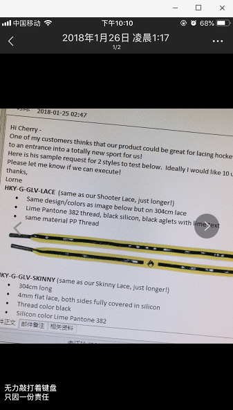 比如,用我的指甲圖片利用女人都愛美的心理,成功和一個美國女客戶有共同話題,加深彼此的好感度。最后下了個很大的樣品單,20款不同設計的鞋帶,雖然后面她的這個項目被迫暫停了,她說項目啟動一定會找我下單,認定我了。雖然挺可惜,但通過她這個樣品單,我學到了很多生產(chǎn)設計的技術東西,后面有了她的樣品作為參考,做了很多其他客戶的類似的款式訂單。