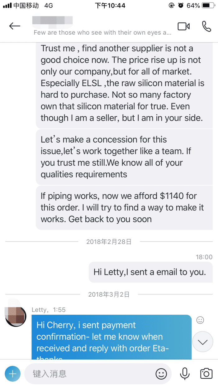 剛入行一年多,外貿小白的我跟20年的老采購漲價(后來領英才知道她做了20年在那家公司),嚇得我呀,真的是斗智斗勇,那時候每天睡不著覺,我的大客戶啊。如圖,后來同意并且直接付款(請忽略個別錯誤單詞)。